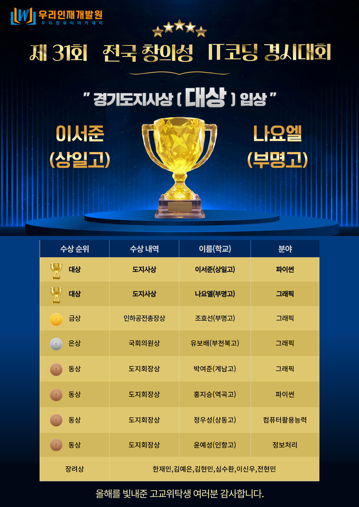 우리인재개발원 2025년도 고교위탁생 전국 창의성 IT코딩 경시대회 입상