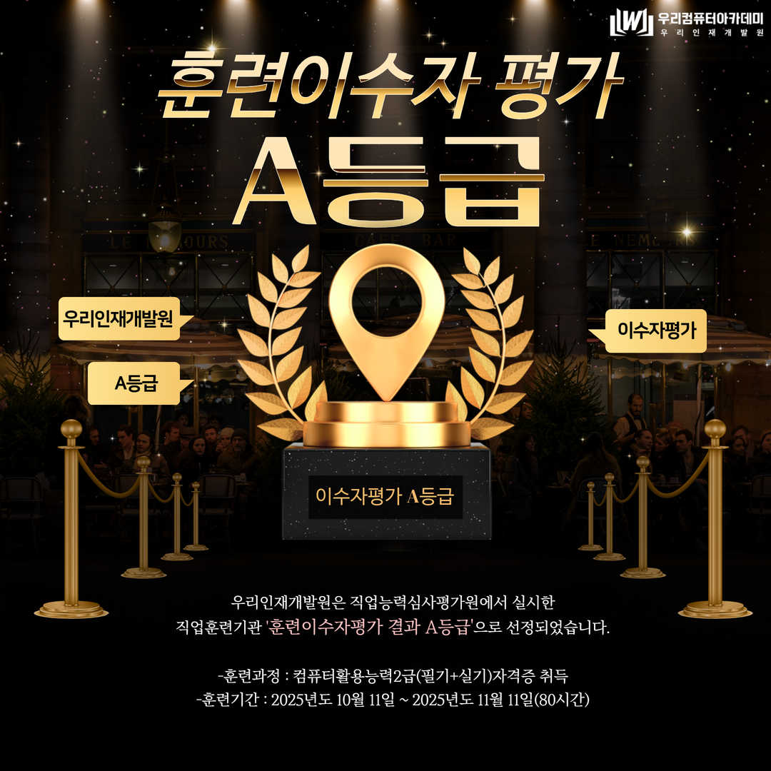 직업훈련기관 '훈련이수자평가 결과 A등급'으로 선정되었습니다.